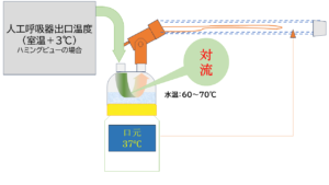 この3つの条件があれば100℃にならなくても、水は水蒸気化してコップの水が減っていくのです。したがって、人工呼吸器用加温加湿器は、加温加湿器の水面を通過する吸気ガスの温度が、水面の温度より低いこと、そして、吸気ガスが通過すること(対流があること)の条件によって、効果的な加温・加湿が可能になるという事です。